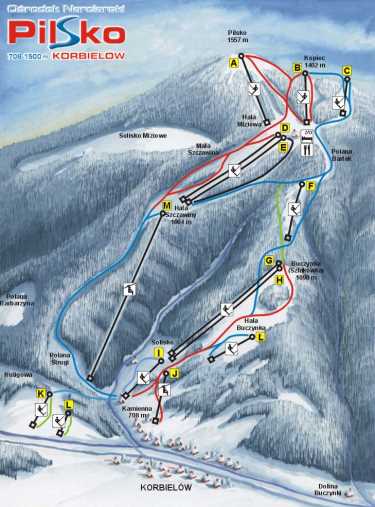 На вершину Пильска вас поднимут 14 современных подъемников – бугельные, кресельные и тарелочные. Самые маленькие подъемники расположены у подножия вершины и обслуживают две учебные зеленые трассы – «осликовые долины». Остальные подъемники предназначены для одностороннего подъема на разные участки горы. Большая пропускная способность, беспрерывное функционирование и ошеломляющие бескидские пейзажи, которые можно наблюдать с подъемников – все это позитивно сказывается на популярности курорта.