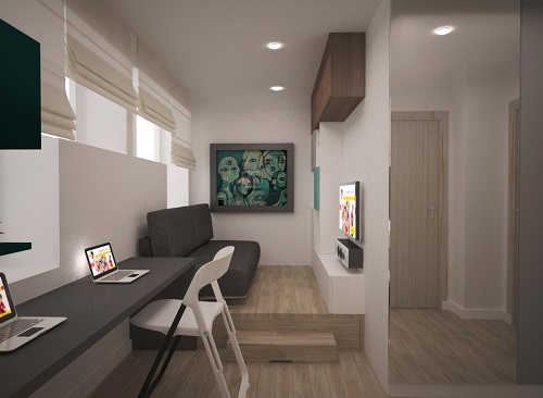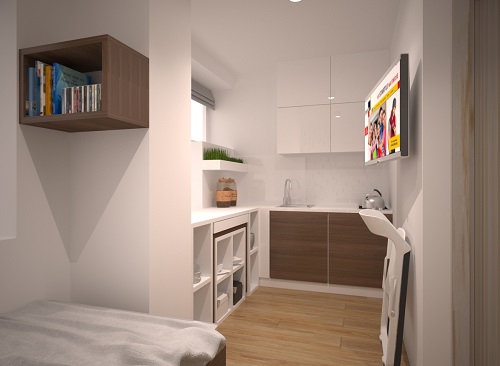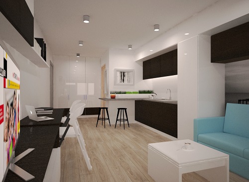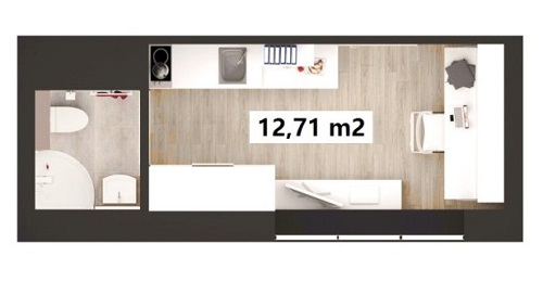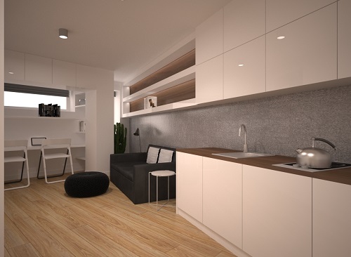 В 11-ти этажном доме будут построены квартиры площадью от 13 до 34,5 м2. Каждая квартира включает гостиную, совмещенную с кухней, а также небольшой совмещенный санузел. В больших квартирах помимо гостиной будет выделена небольшая спальня.