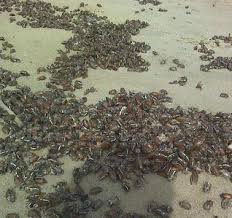 Напомним, в конце мая на морском берегу от Зеленоградска до Куршской косы скопилось огромное количество мёртвых насекомых. Массовый вылет майских жуков совпал с грозой. Сильными порывами ветра жуков снесло в море, а дождь сбил их в воду. Мёртвые жуки (кроме майских, попадаются колорадские и другие насекомые) были выброшены волнами на берег и остались в прибрежной зоне.