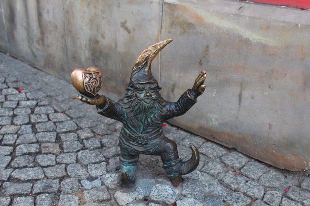 Еще один местный гном держит большое сердце в руке, на котором изображен герб Вроцлава. Он любит свой город. К слову, говорят, что именно этот гном призвал своих маленьких собратьев показаться жителям и гостям города.