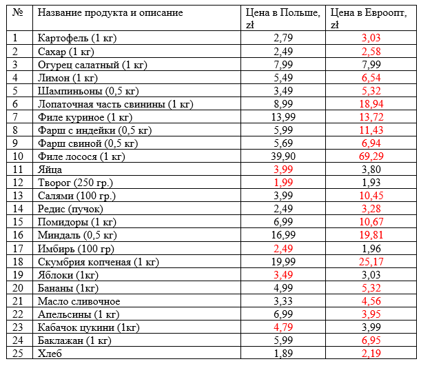 Для удобства все продукты разместили в таблицу, а стоимость белорусских товаров перевели в польский злотый. Более высокую цену выделим красным, а в конце подведем итог.