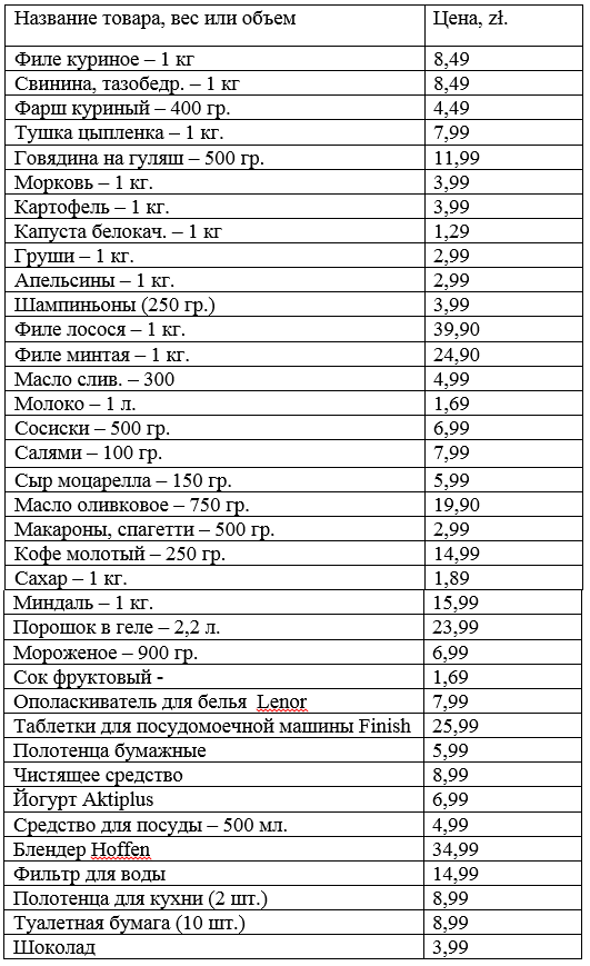 Ответы на них могут быть разными и зависят от потребностей конкретного человека или семьи. Но мы решили провести небольшой эксперимент и «сделать закупы» в одном из супермаркетов Польши на конкретную сумму – а именно 100 у.е. или примерно 380 злотых.